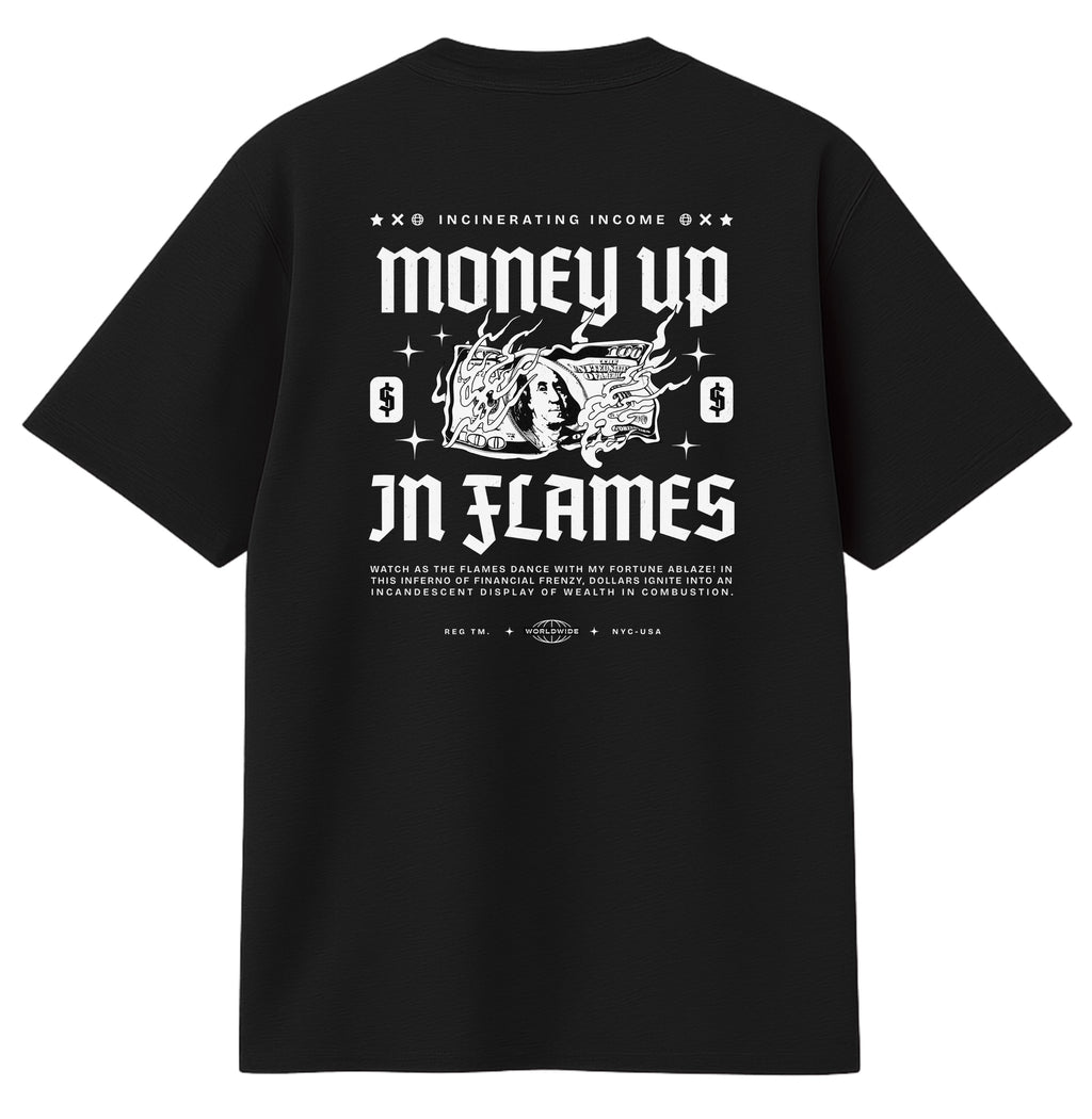 A camiseta “MONEY UP IN FLAMES” traz uma crítica visual ao consumo, ao luxo descartável e ao caos financeiro moderno. Com uma arte impactante que mostra notas de dinheiro em chamas, a peça combina estilo urbano, ironia e estética dark streetwear.